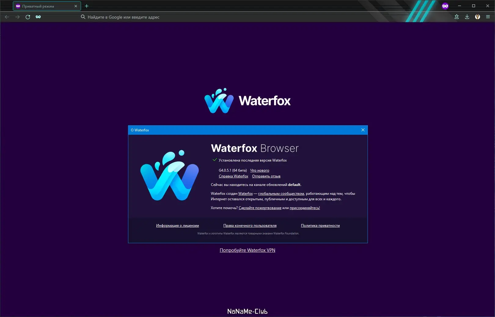 Waterfox — это высокопроизводительный браузер, созданный на основе исходного кода Mozilla Firefox и оптимизированный для 64-разрядных систем. Программа сочетает в себе знакомый интерфейс и расширенные возможности, обеспечивая быструю загрузку страниц и стабильную работу в интернете.