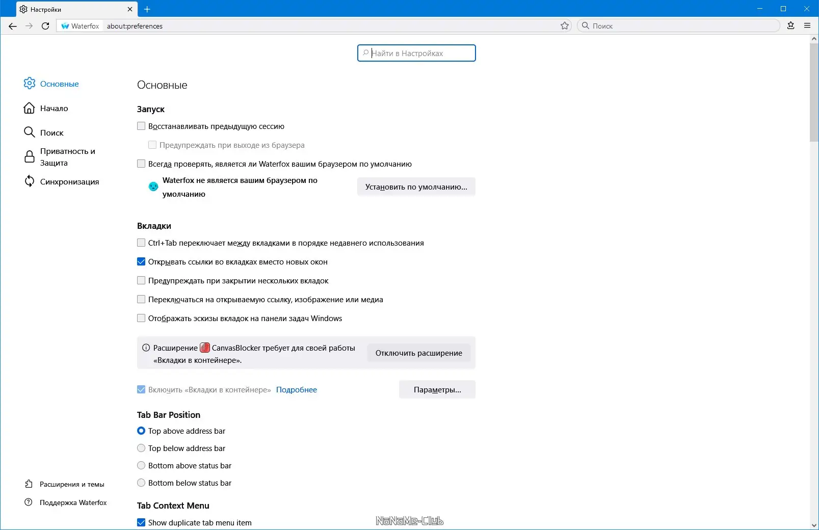 Работа с Waterfox