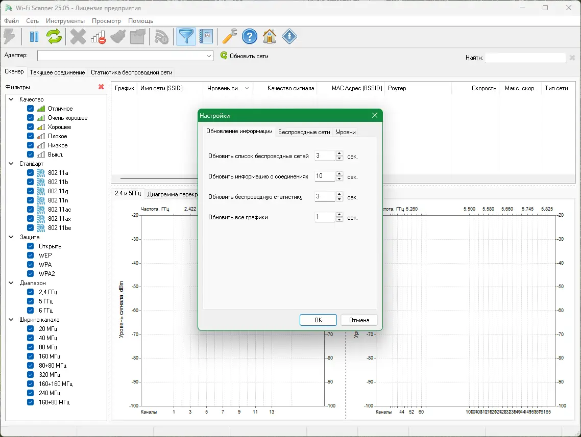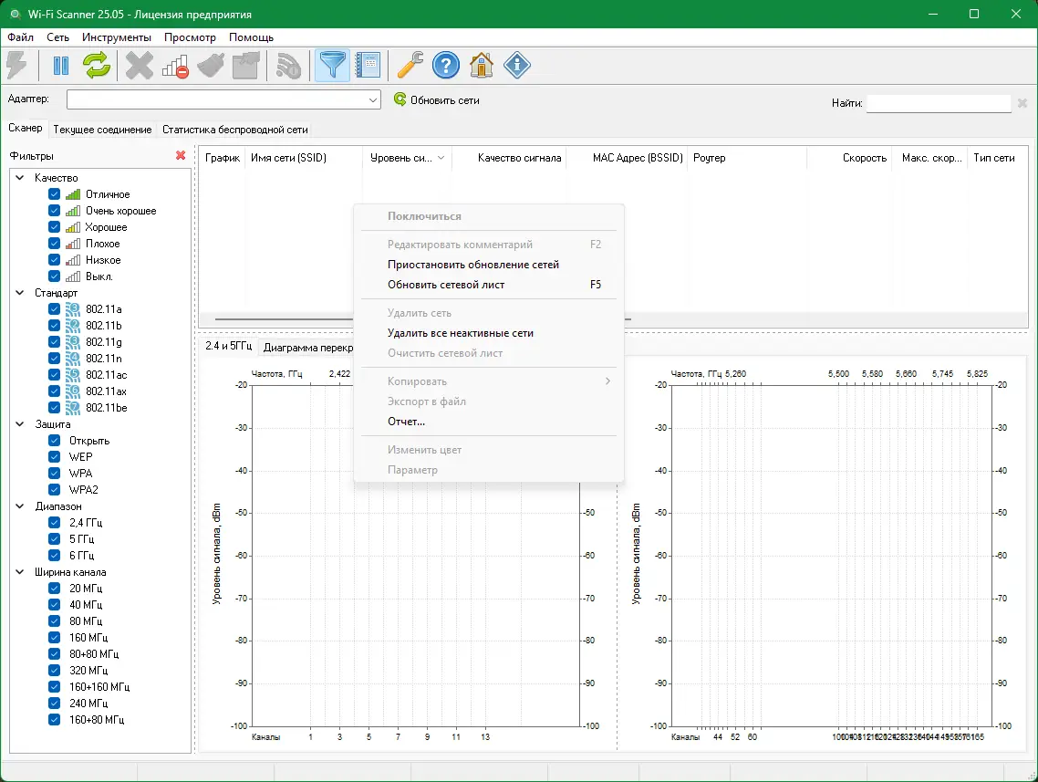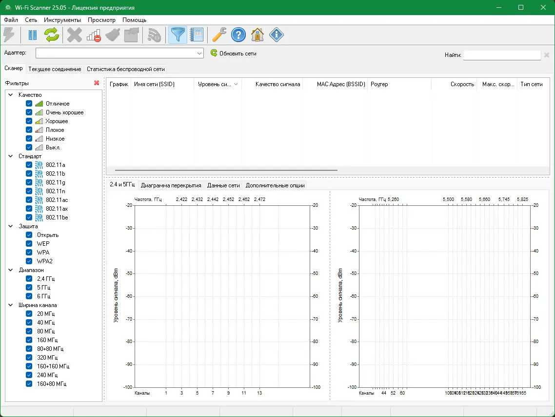 Wi-Fi Scanner предназначен для диагностики и мониторинга Wi-Fi сетей в реальном времени. Он поддерживает современные стандарты беспроводной связи и работает с сетями на частотах 2,4 и 5 ГГц. Программное обеспечение подходит как для домашнего использования, так и для профессиональной настройки корпоративных сетей.