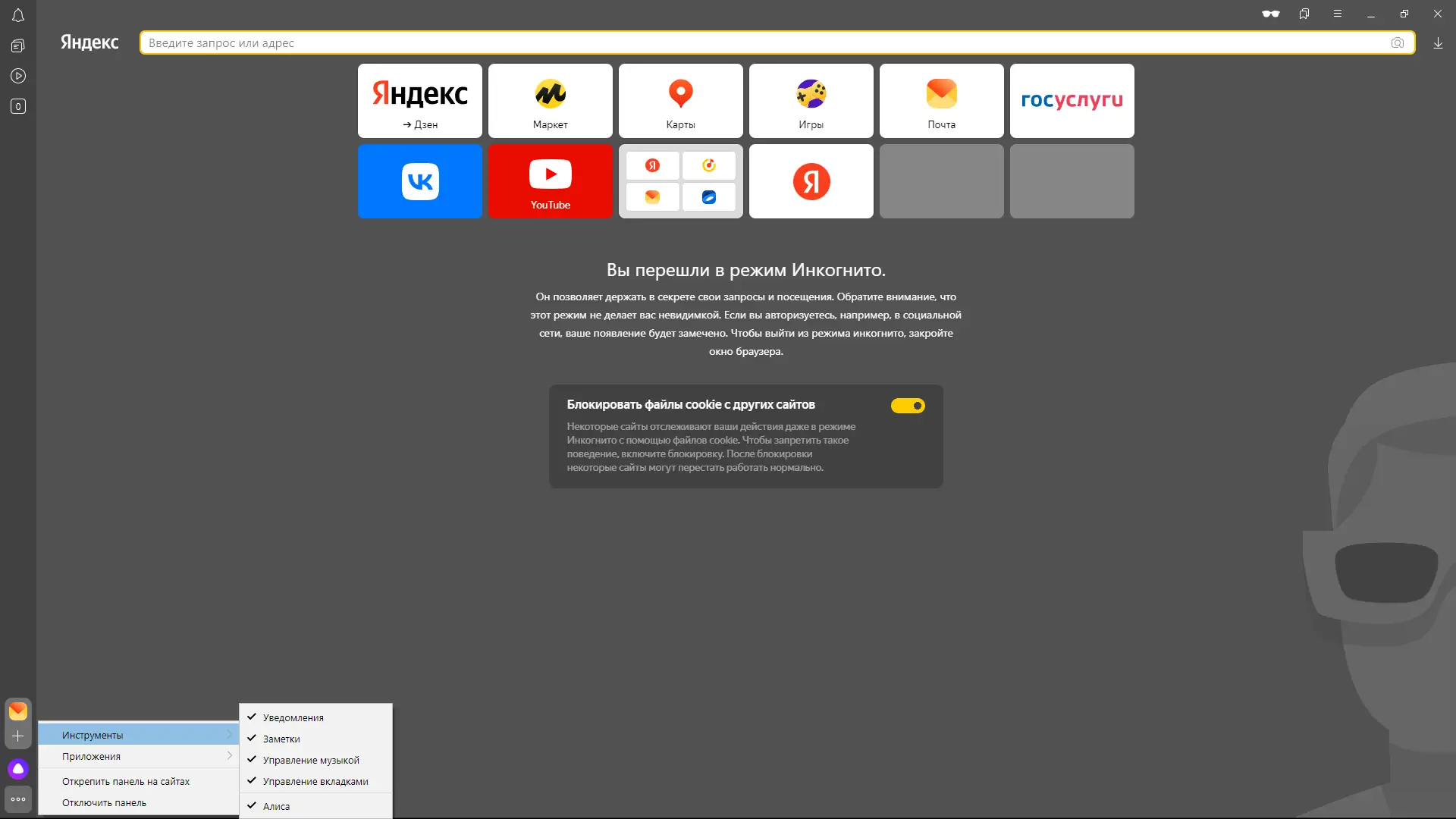 Использование браузера не требует специальных навыков. После запуска открывается новая вкладка с Табло — панелью часто посещаемых сайтов, которую можно настроить вручную. Умная строка в верхней части окна объединяет функции поиска и адресной строки: достаточно начать вводить запрос, чтобы получить подсказки и результаты от Яндекс. Для перевода текста с картинок или видео используется встроенный переводчик, который поддерживает несколько языков. Пользователь может создавать группы вкладок, чтобы систематизировать открытые страницы по темам. Боковая панель предоставляет доступ к Алисе, мессенджеру, заметкам и музыке. Экспорт паролей в файл позволяет сохранить данные для переноса на другое устройство. Блокировка трекеров защищает приватность, а защита платежей снижает риски при онлайн-покупках. Скриншоты можно делать как с веб-страниц, так и с любого окна на экране. Работа с веб-приложениями позволяет открывать сервисы в отдельных окнах, не загромождая основной интерфейс.