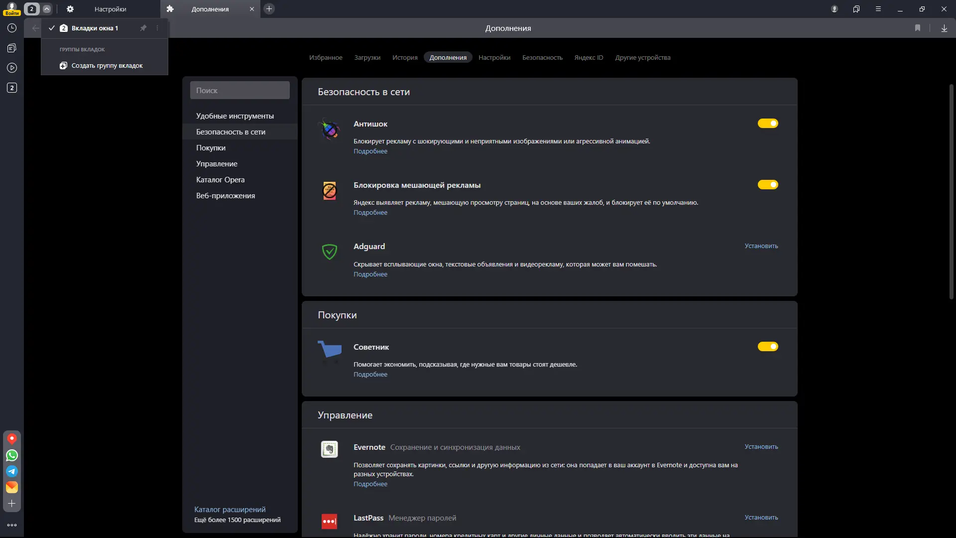 - Удобные инструменты: переводчик, субтитры, веб-приложения, группы вкладок и боковая панель.