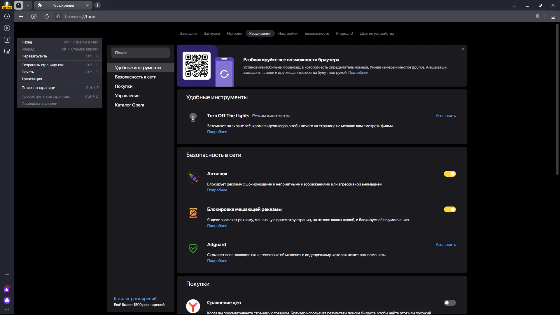 - Наличие встроенных инструментов: переводчик, скриншоты, менеджер паролей, защита от вирусов