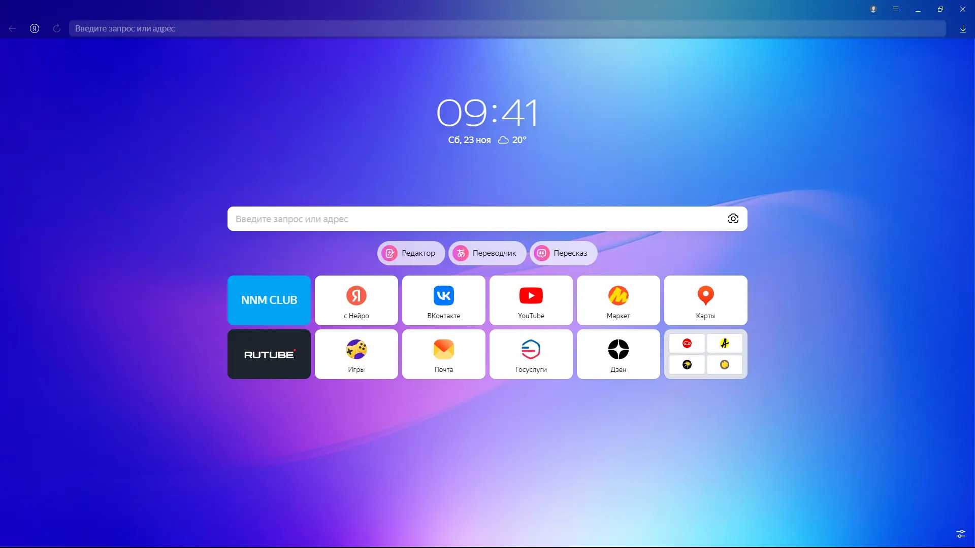 - Быстрый доступ к сервисам Яндекса и встроенные нейроинструменты для обработки текста и видео
