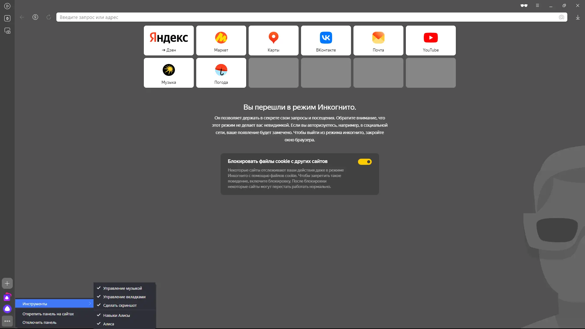 - Удобная боковая панель с доступом к Алисе, Мессенджеру, заметкам и сервисам Яндекса.