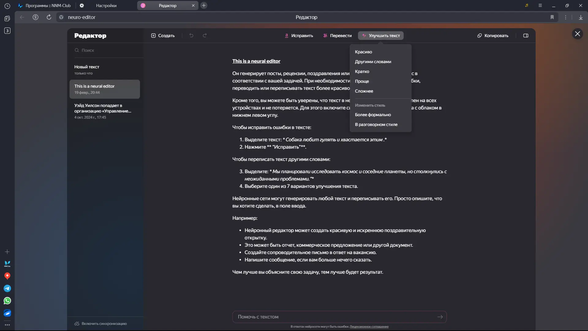 - Встроенные нейроинструменты, включая перевод видео, генерацию текстов и изображений с помощью YandexGPT.