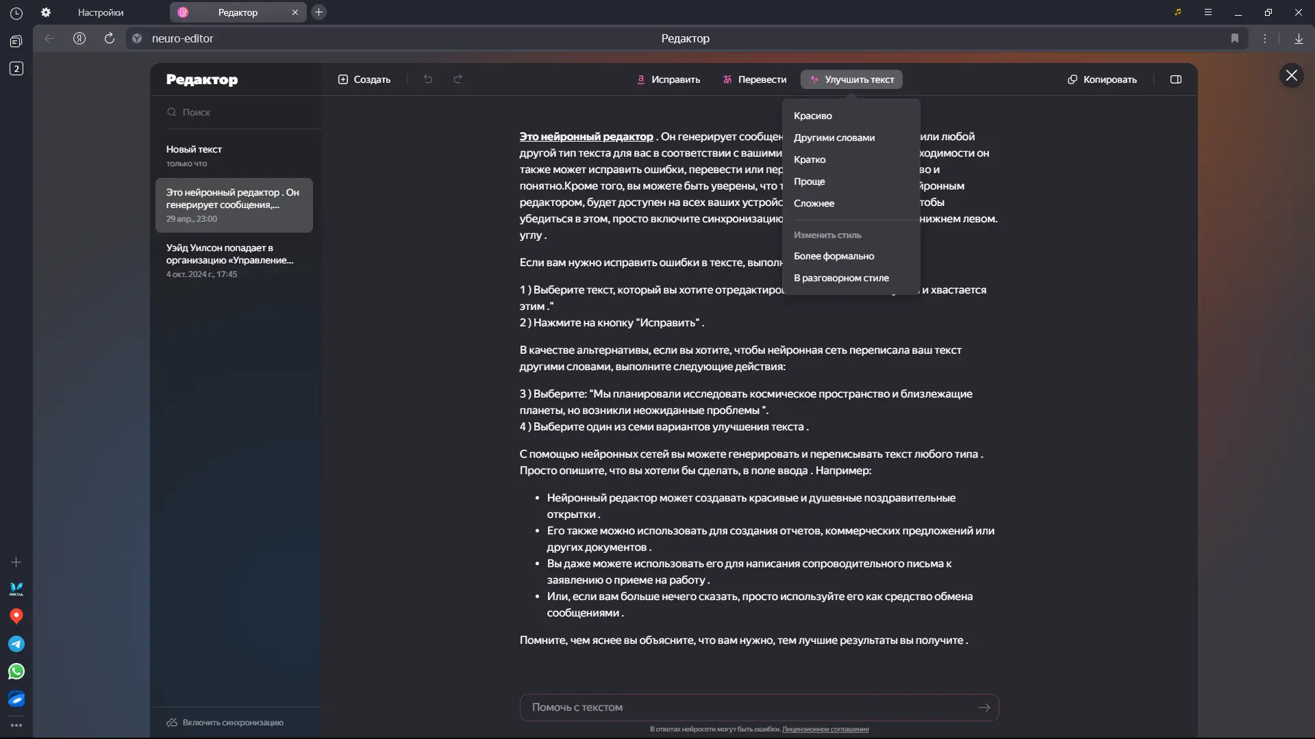 Браузер активно использует искусственный интеллект для улучшения пользовательского опыта, включая автоматический пересказ статей и генерацию контента.