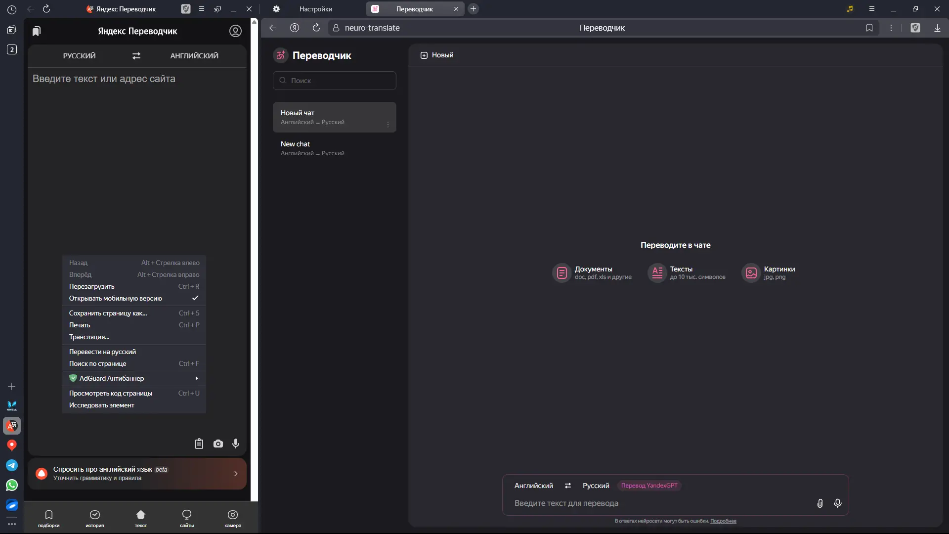 - Встроенные нейросети для перевода, анализа и создания контента, включая генерацию изображений и текстов.