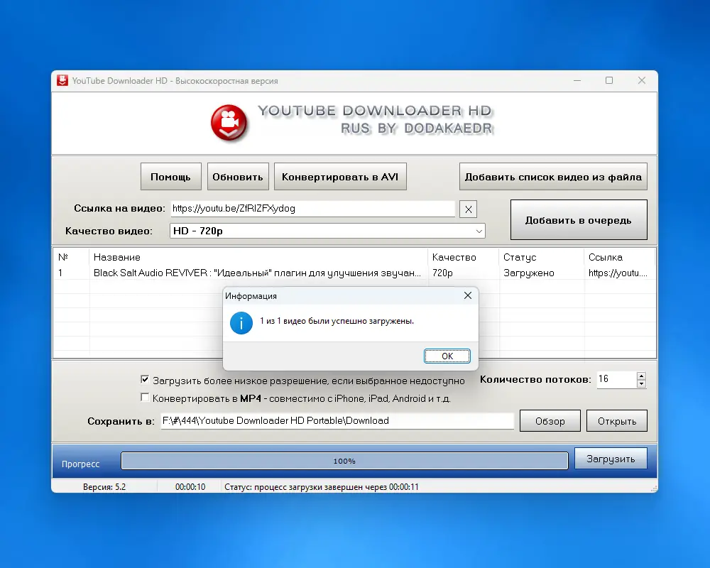 Youtube Downloader HD — это легковесное приложение для быстрого и удобного получения видео с YouTube в высоком и ультравысоком качестве, включая форматы Full HD, 4K Ultra HD и Quad HD. Программа поддерживает сохранение файлов в популярных форматах MP4 и AVI, совместимых с iPhone, iPad и другими мобильными устройствами, а также предлагает простой интерфейс и функцию конвертации «в один клик».