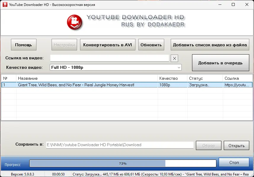 Использование приложения не вызывает трудностей даже у новичков. Достаточно скопировать ссылку на YouTube-ролик, вставить её в основное поле программы и выбрать папку для сохранения. После этого указывается желаемый формат — AVI или MP4 — и запускается процесс. Система автоматически определяет доступные качества и предлагает выбрать подходящее. Как пользоваться дополнительными настройками, можно понять интуитивно, поскольку все элементы интерфейса имеют понятные обозначения. В процессе загрузки отображается прогресс, оставшееся время и скорость соединения.