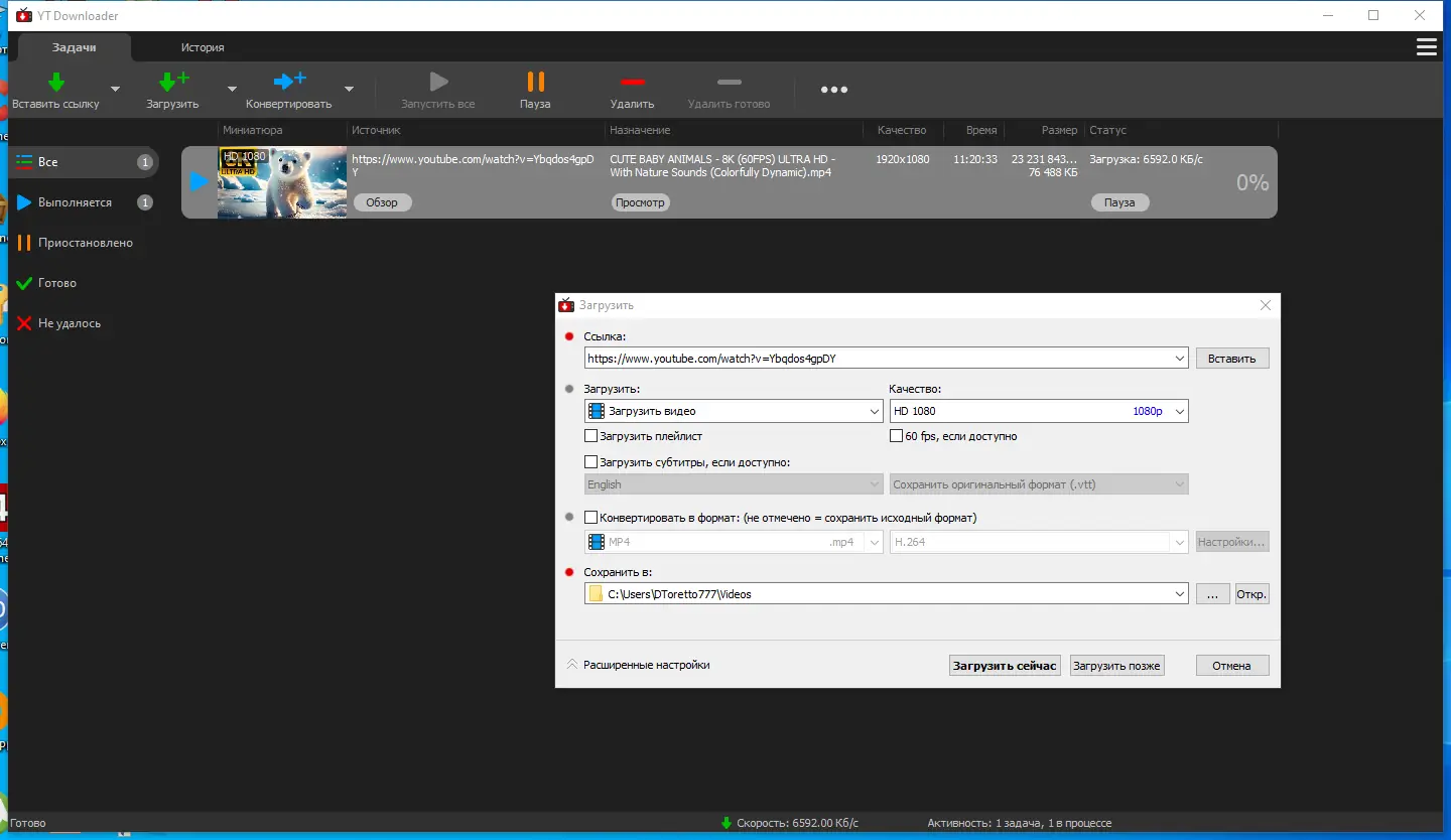 Использование программы предельно простое: достаточно скопировать ссылку на видео из браузера и вставить её в интерфейс приложения. Также доступна функция drag-and-drop — можно просто перетащить URL прямо в окно программы. После анализа ссылки пользователь выбирает желаемое качество и формат, например, mp4 или аудио в mp3. Для тех, кто работает с большими объёмами контента, реализована возможность скачать целый плейлист с YouTube за один раз. Поддержка многопоточной загрузки позволяет одновременно обрабатывать несколько видео, а функция приостановки и возобновления делает процесс гибким. Встроенная система конвертации помогает адаптировать файлы под любые устройства, а медиаплеер позволяет просматривать контент без необходимости установки дополнительных проигрывателей. Работа в offline возможна сразу после завершения загрузки.