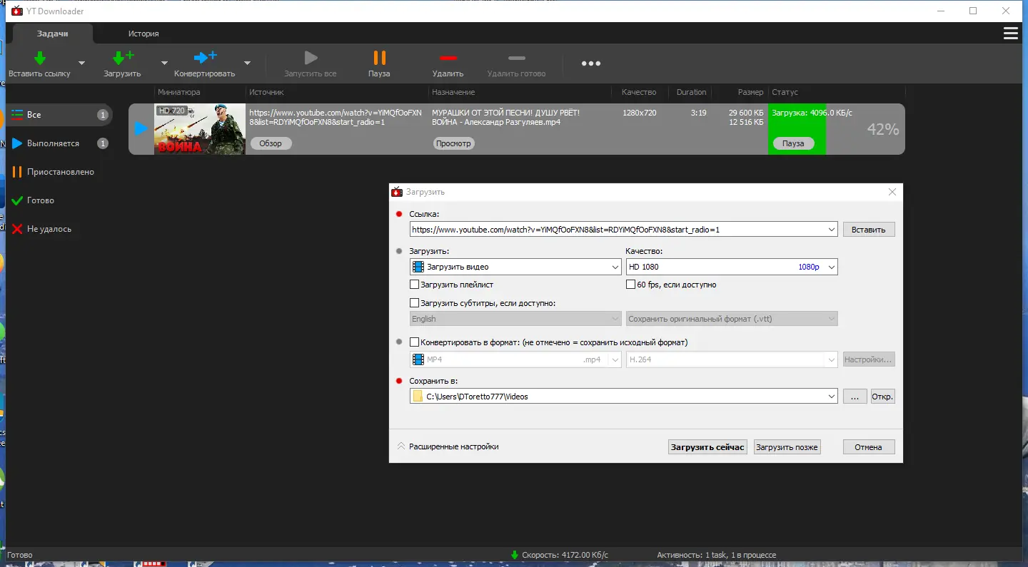 - Поддерживается скачивание целых плейлистов с YouTube, что экономит время при массовой загрузке контента.