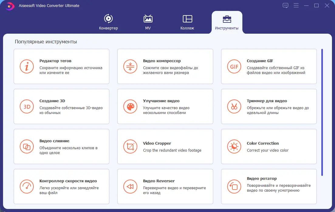 Aiseesoft Video Converter Ultimate — это универсальное программное обеспечение, предназначенное для преобразования, редактирования и управления видеофайлами. Оно позволяет работать с DVD, Blu-Ray, папками дисков и обычными видеофайлами, конвертируя их в популярные форматы. Поддержка 4K, 8K и 3D-видео делает её подходящей для современных медиатребований. Программа также извлекает аудиодорожки, конвертируя их в аудиофайлы популярных форматов. Встроенный видеоредактор предоставляет доступ к настройке яркости, контрастности, обрезке, повороту и объединению клипов.