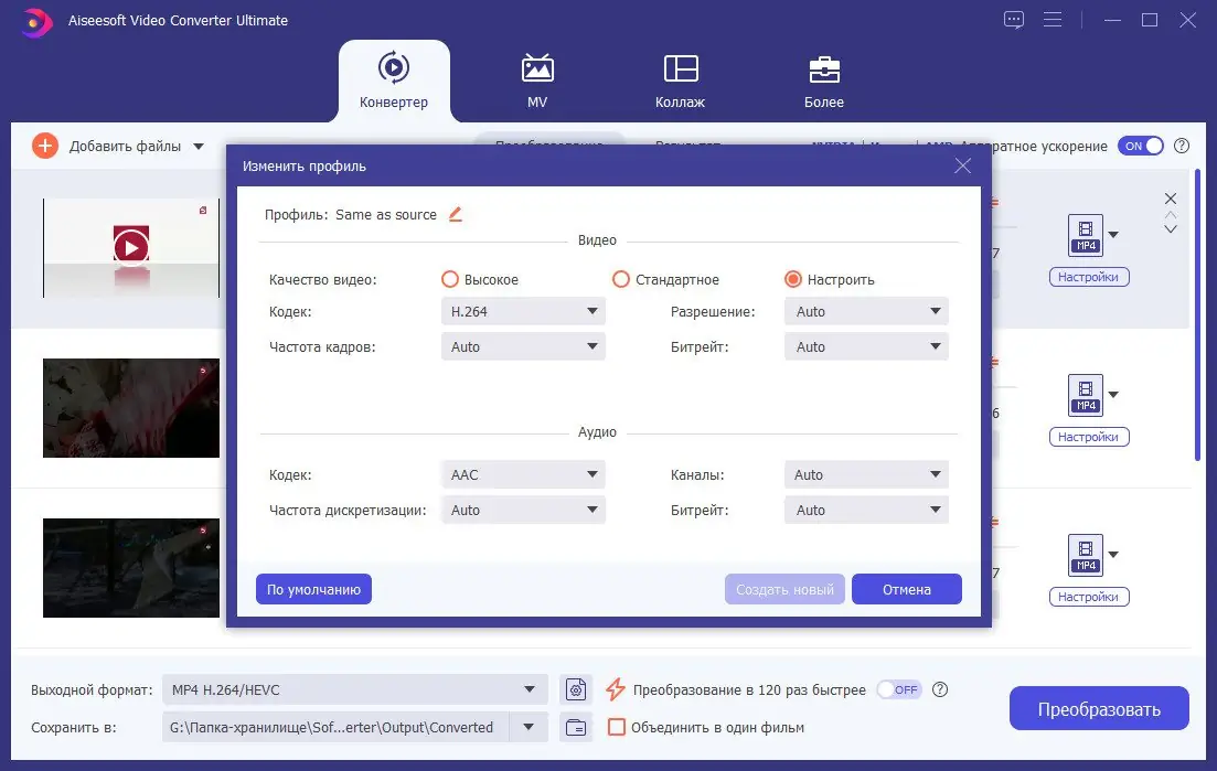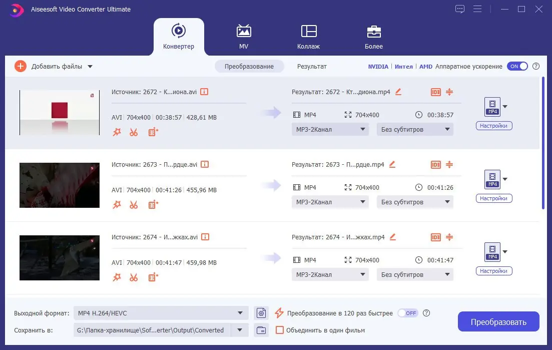 - Поддержка конвертации видео в форматы MP4, AVI, MKV, MOV, FLV, WMV и другие с возможностью выбора разрешения до 4K Ultra HD.