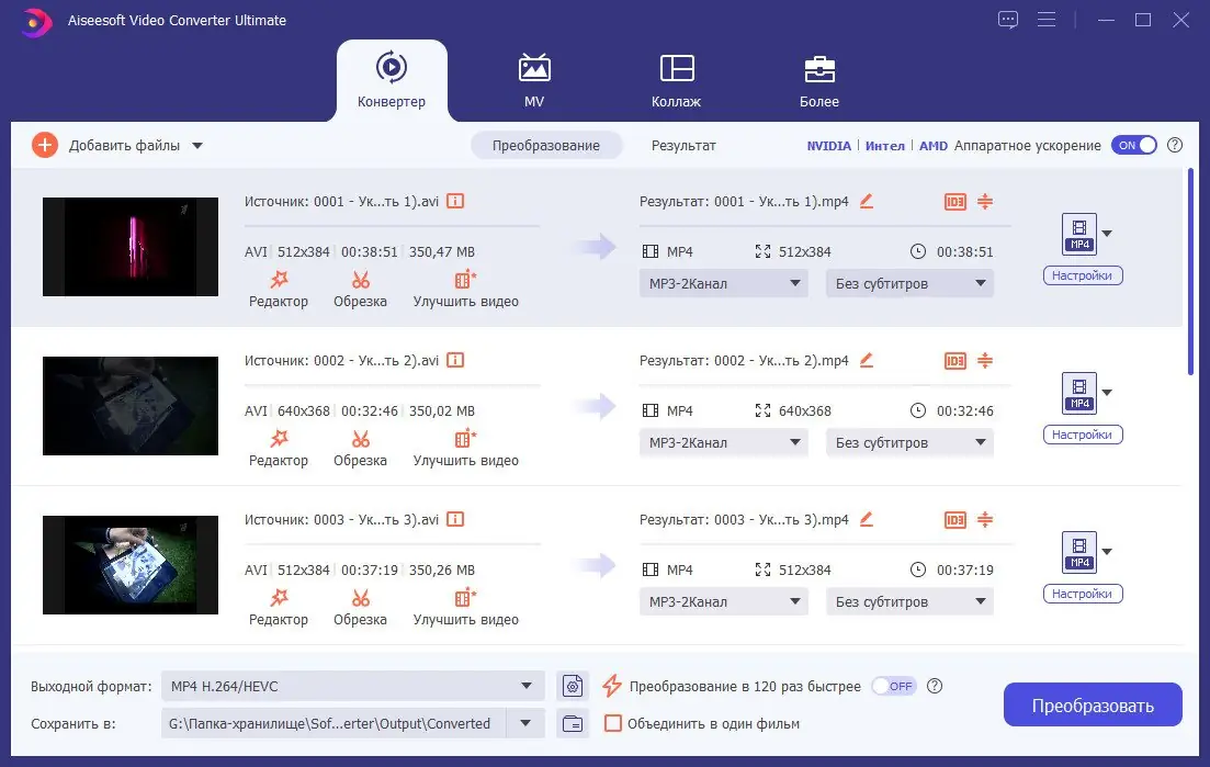 - Высокая скорость конвертации с поддержкой современных кодеков и аппаратного ускорения.