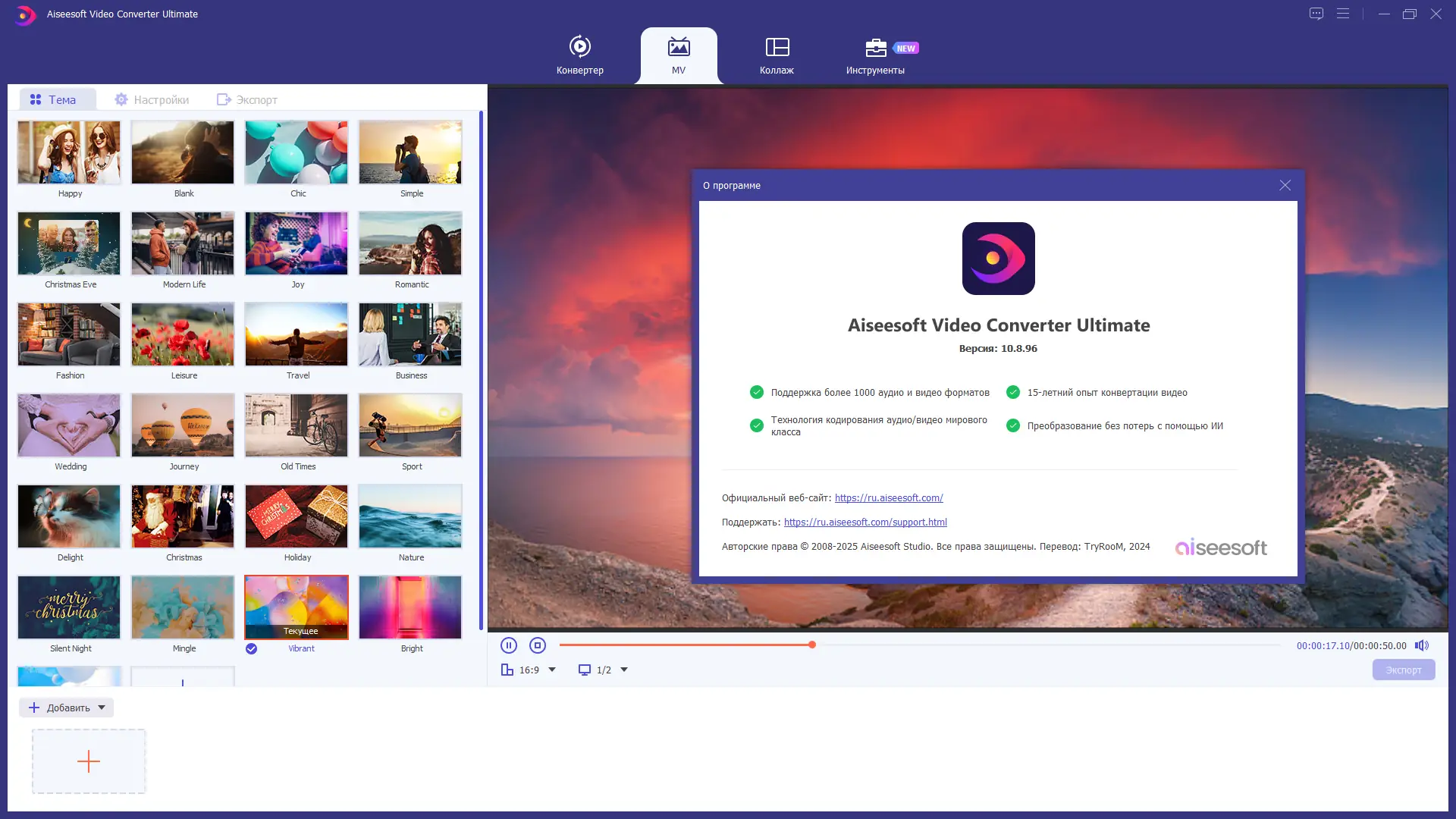 Aiseesoft Video Converter Ultimate — это многофункциональный мультимедийный инструмент, предназначенный для обработки видео и аудио. Он позволяет конвертировать контент в форматы, совместимые с широким спектром устройств, включая мобильные гаджеты, игровые приставки и проигрыватели. Программа поддерживает работу с высоким разрешением, включая HD и 4K UltraHD, что делает её удобной для современных задач.