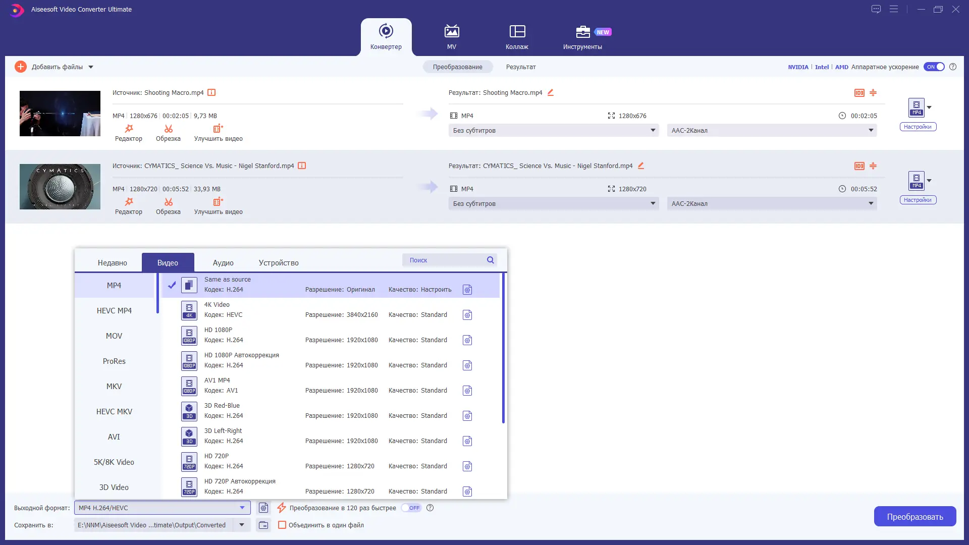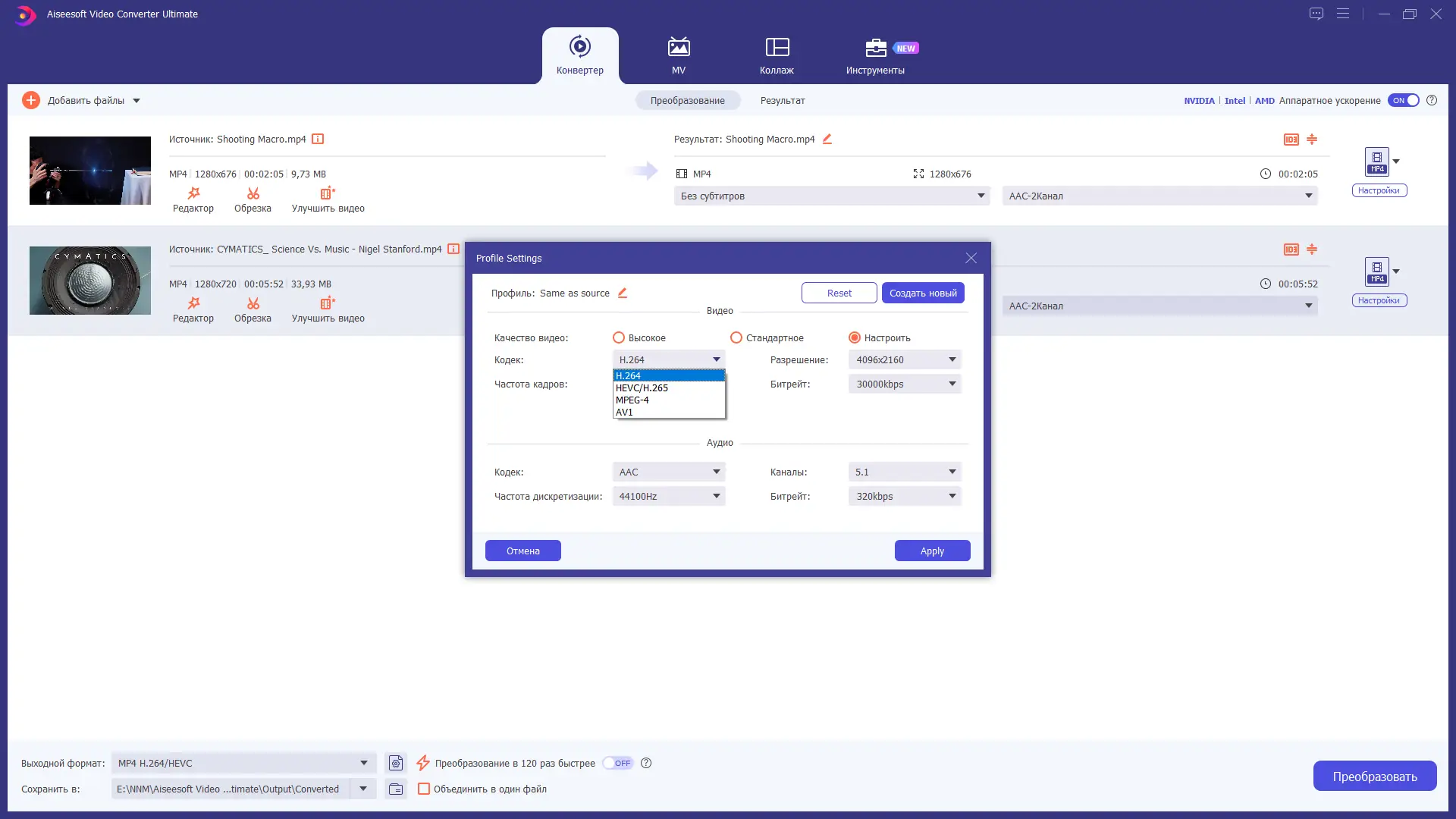 - Гибкие настройки кодирования, включая параметры видео и аудио, а также возможность слияния нескольких файлов в один выходной.