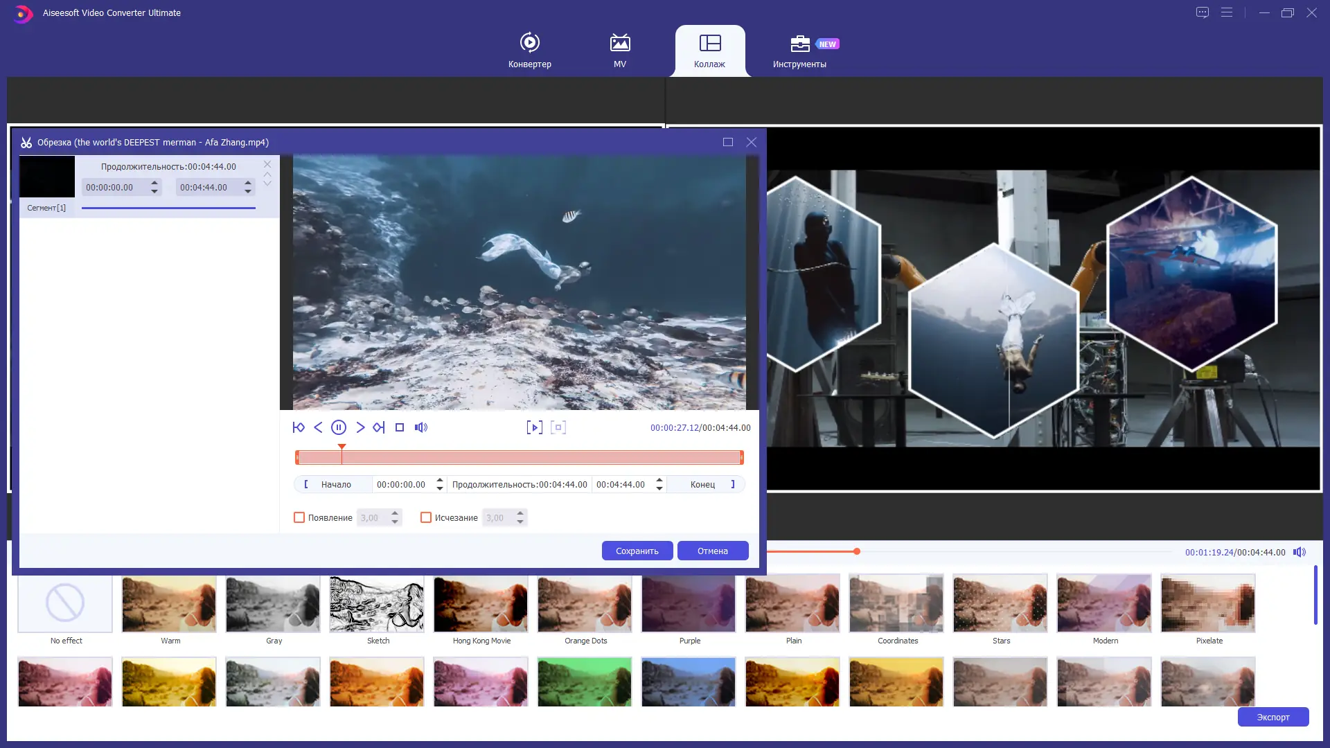 - Позволяет редактировать видео перед конвертацией: обрезать, объединять, добавлять водяные знаки и корректировать цвета.
