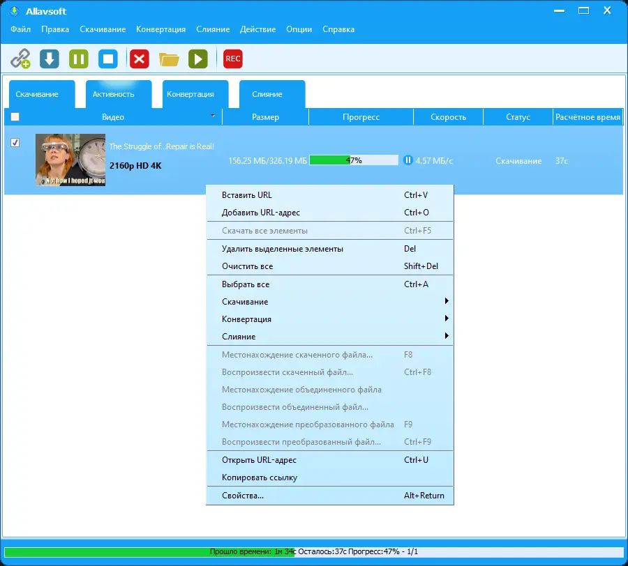 Использование приложения не требует специальных навыков. Достаточно скопировать ссылку на видео и вставить её в главное окно программы. Allavsoft автоматически определит доступные форматы и разрешения, предложив выбрать нужный. После подтверждения начнётся процесс загрузки, который можно приостанавливать и возобновлять. Встроенная система предварительного просмотра позволяет проверить качество файла до окончания загрузки. Дополнительно доступна функция пакетной обработки, что особенно удобно при работе с плейлистами.