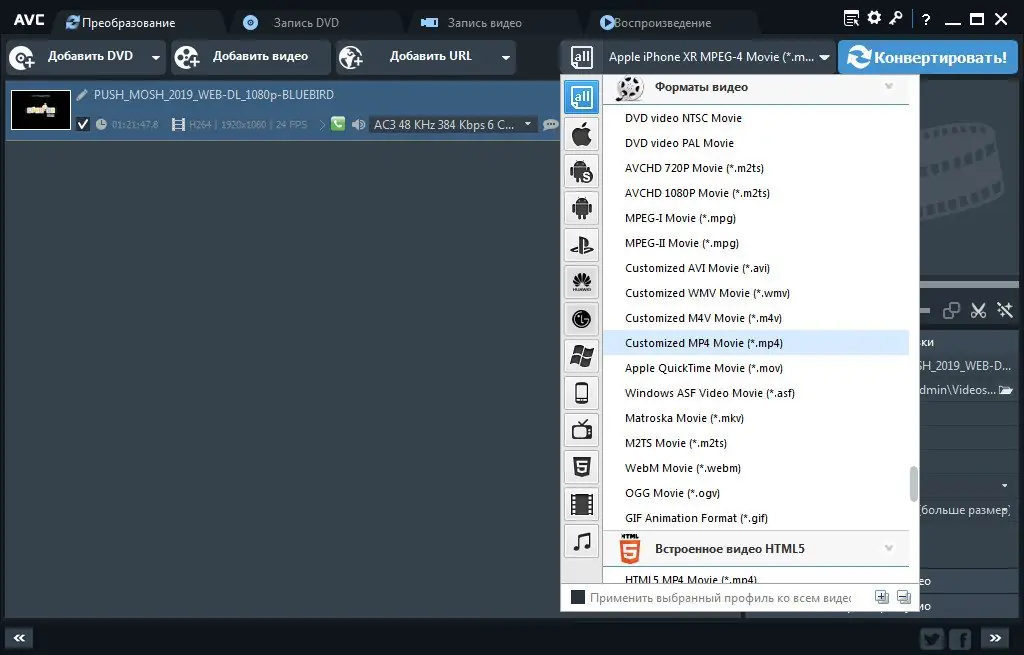 - Поддерживается редактирование видео: обрезка, объединение, добавление субтитров и эффектов перед конвертацией.