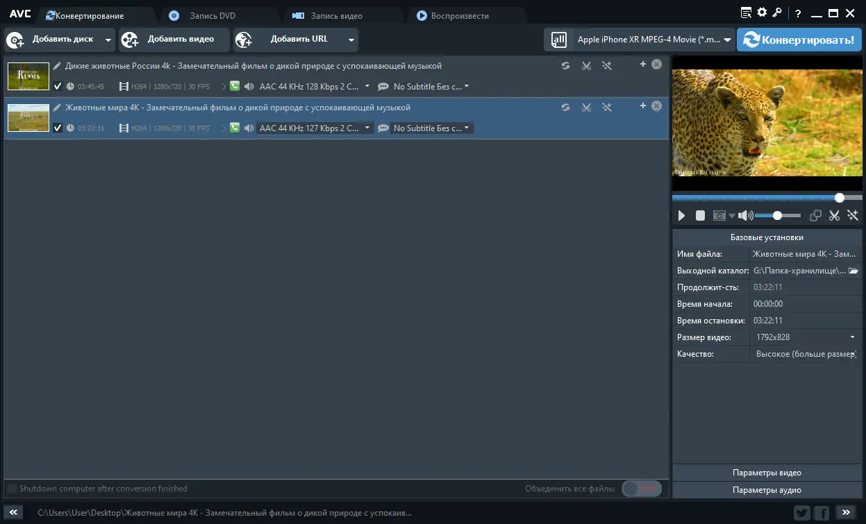 - Поддержка конвертации всех популярных видеоформатов, включая высококачественные HD-ролики