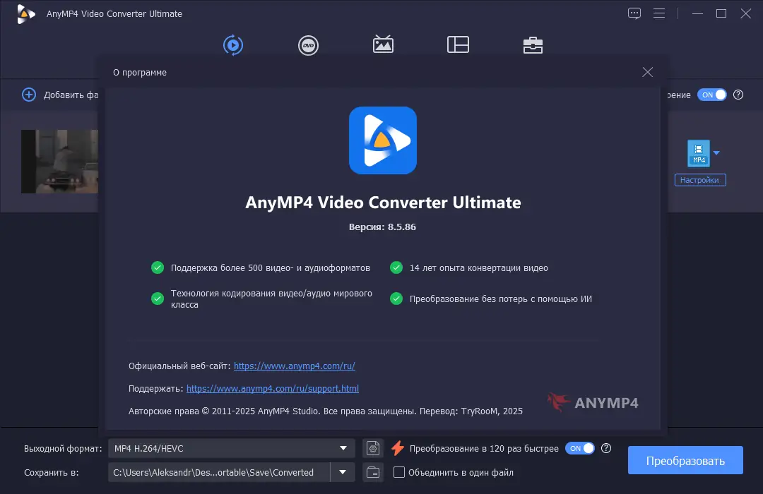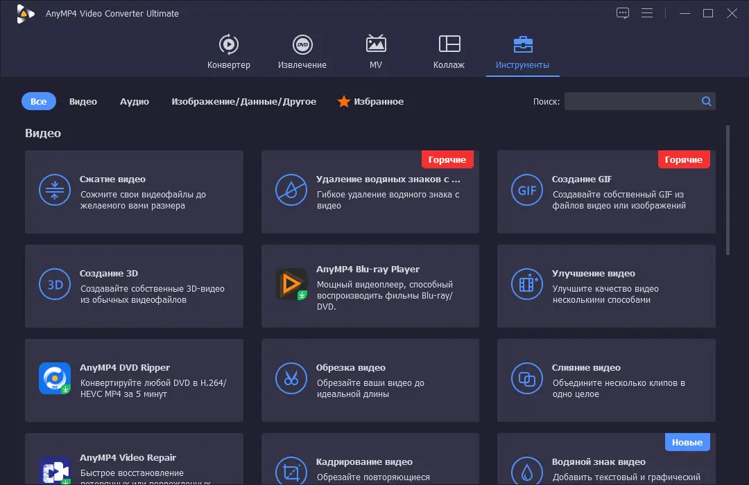 AnyMP4 Video Converter — универсальное решение для преобразования видеофайлов с поддержкой 2D, 3D и высоких разрешений включая 4K и 8K. Программа обеспечивает быстрое и качественное кодирование, поддерживает широкий спектр форматов и устройств, а также предлагает инструменты редактирования и настройки изображения.