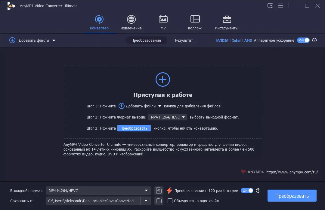 AnyMP4 Video Converter представляет собой мощное программное обеспечение, предназначенное для конвертации видео в различные форматы с минимальной потерей качества. Программа поддерживает обработку как стандартных, так и высококачественных видео, включая 4K, 5K и 8K контент, закодированный с использованием H.265/HEVC. Это делает её подходящим выбором для пользователей, работающих с современными медиаформатами и требующих высокой скорости обработки.