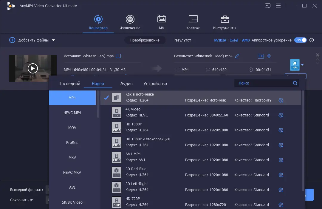 - Поддержка конвертации видео с разрешением до 8K в форматах H.265 и H.264.