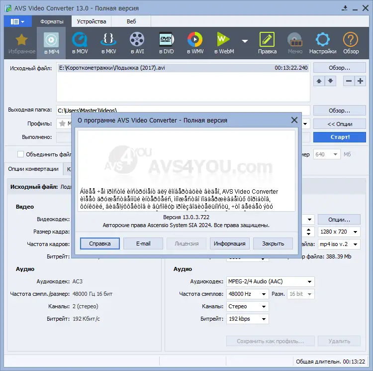 - Поддерживает широкий спектр входных и выходных форматов, включая AVI, MP4, MOV, MKV, FLV, TS, MOD и другие.