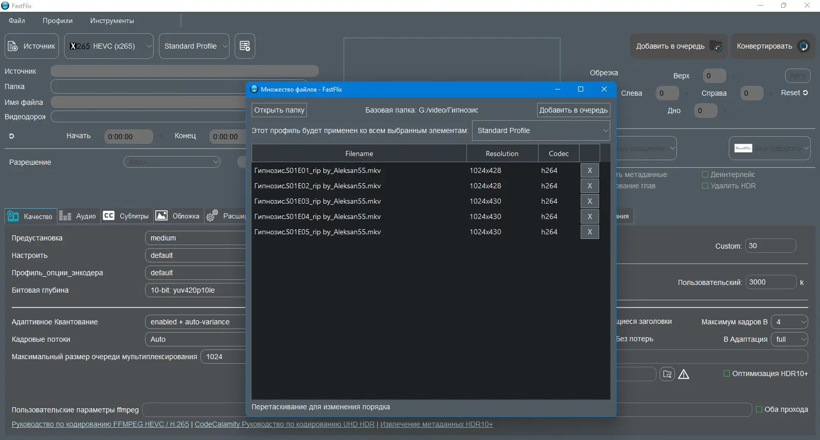 FastFlix — это современный инструмент с интуитивным интерфейсом для высококачественного перекодирования видео. Программа поддерживает работу с HDR10 и совместима с мощными кодировщиками, включая x265, NVEncC и VCEEncC, обеспечивая точный контроль над параметрами конвертации. Подходит как для новичков, так и для опытных пользователей, которым важна сохранность метаданных и настройка деталей обработки.