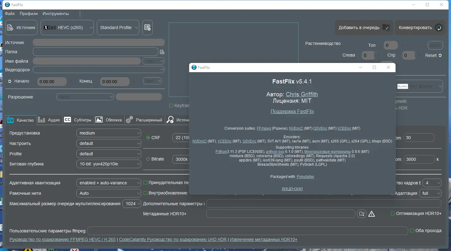 FastFlix — это удобный инструмент для перекодирования видео с поддержкой современных кодеков и сохранением метаданных HDR10. Программа работает на базе FFmpeg и предоставляет доступ к широкому спектру настроек, включая битрейт, глубину цвета, частоту кадров и параметры качества. Поддерживает аппаратные ускорители и готова к интеграции с AV1 при появлении соответствующих библиотек.