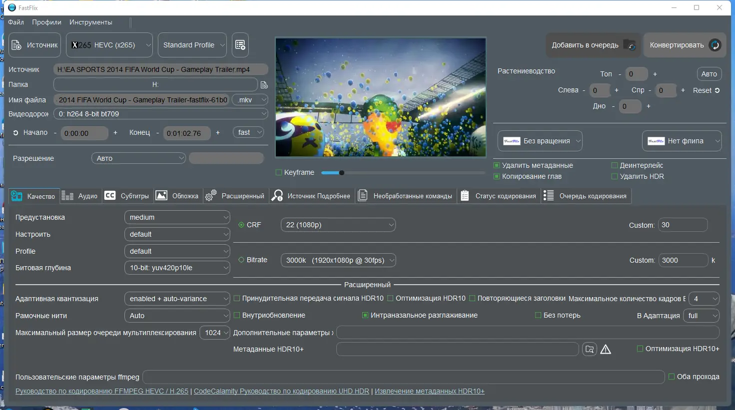 - Гибкие настройки битрейта, CRF, битовой глубины и частоты кадров