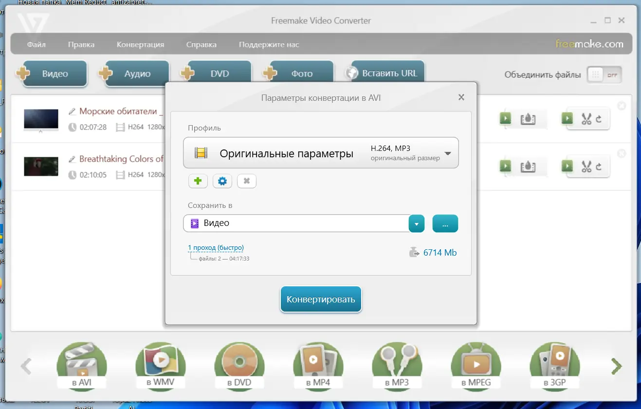 - Конвертирует видео в более чем 500 форматов, включая популярные MP4, AVI, MKV и WMV.