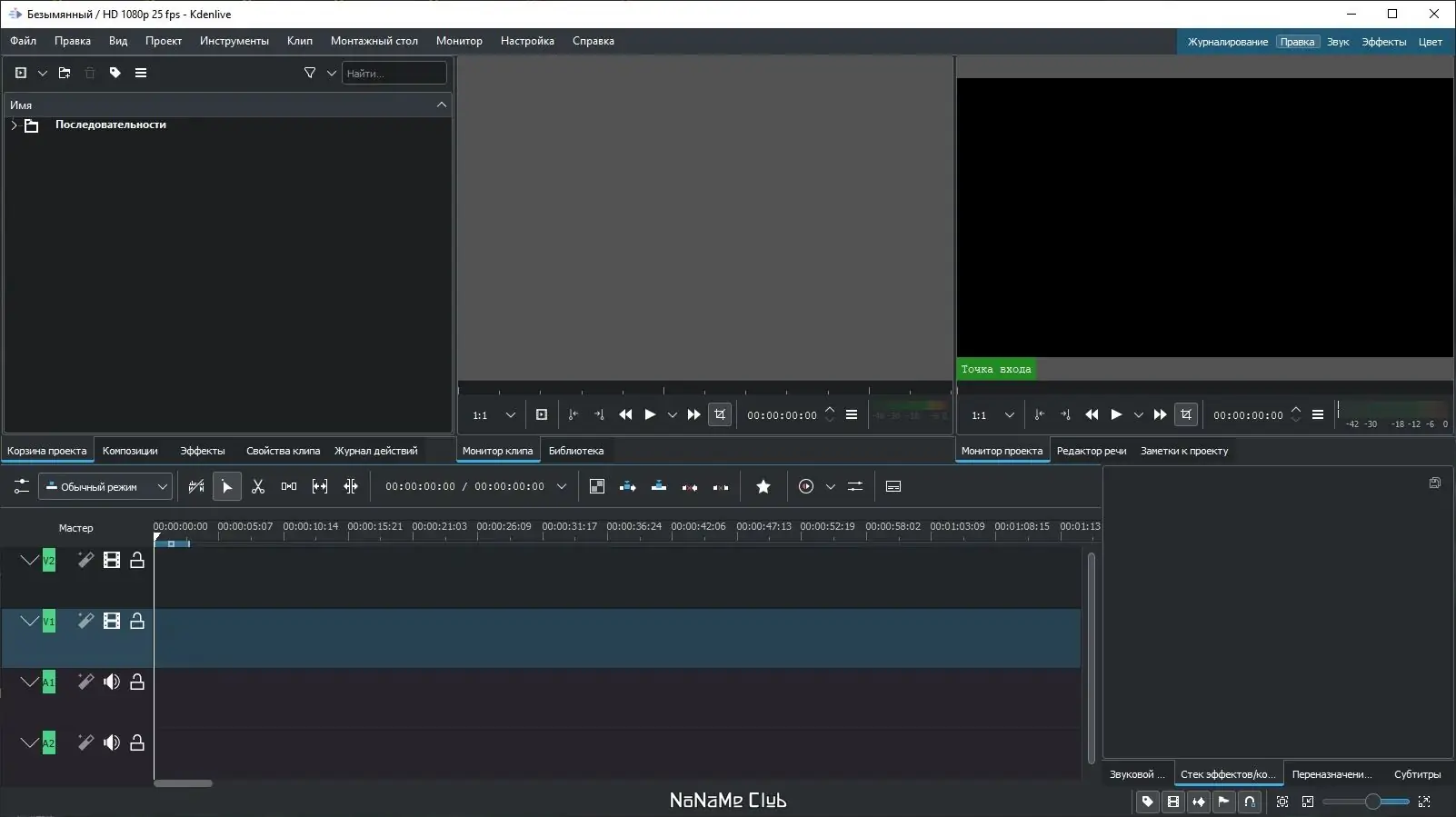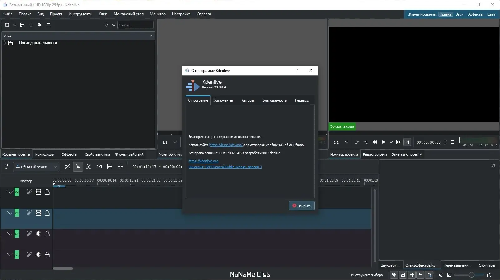 Kdenlive — это мощный и бесплатный видеоредактор с открытым исходным кодом, предназначенный для нелинейного монтажа видео на платформе Windows. Программа поддерживает широкий спектр аудио- и видеоформатов, включая AVI, MP4, MKV, MOV и другие, что делает её универсальным решением для обработки материалов с любой камеры. Интерфейс легко настраивается, а встроенные инструменты позволяют создавать сложные проекты с несколькими дорожками, эффектами и переходами.