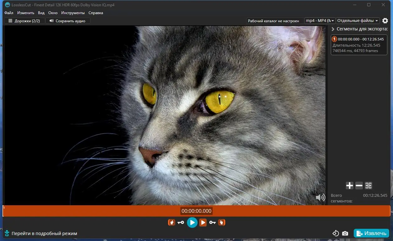 Обработка происходит на уровне потоков, что делает LosslessCut одним из самых быстрых решений для нелинейного монтажа без потерь.