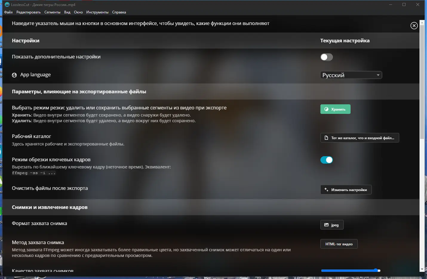 Интерфейс программы интуитивно понятен, а управление осуществляется как через кнопки, так и с помощью горячих клавиш. Для начала работы достаточно открыть файл, перетащив его в окно приложения или воспользовавшись комбинацией Ctrl+O. Далее устанавливаются точки обрезки с помощью клавиш I (начало) и O (конец). Каждый выделенный сегмент сразу отображается на таймлайне, а при необходимости можно добавить множество таких фрагментов. Экспорт выполняется по нажатию клавиши E, после чего выбранный кусок сохраняется без потерь. С помощью клавиши C можно сделать скриншот текущего кадра. Управление воспроизведением осуществляется через пробел, а навигация по видео — с помощью клавиш J, L, точка и запятая для точной подстройки. Подробный мануал по использованию доступен в документации проекта, где описаны все нюансы процесса. Информация о том, как пользоваться, также встроена в справку программы через сочетание H.