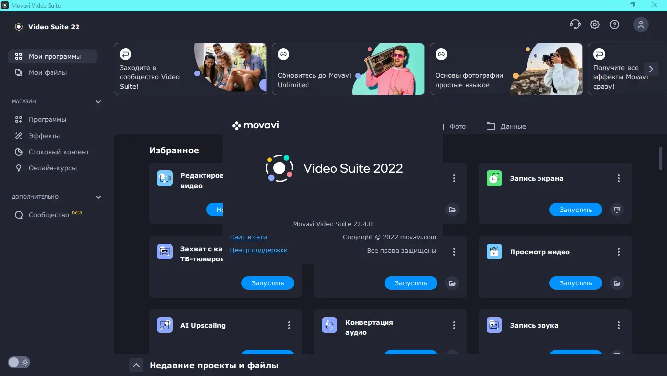 Movavi Video Suite — это универсальный пакет приложений для создания и редактирования видео, фото и аудио на русском языке. Программа подходит как для новичков, так и для опытных пользователей, предлагая интуитивный интерфейс и мощные инструменты для монтажа, обработки и конвертации медиафайлов. С её помощью можно легко создавать слайд-шоу, фильмы, обучающие видео и видеоблоги без необходимости изучать сложные профессиональные редакторы.