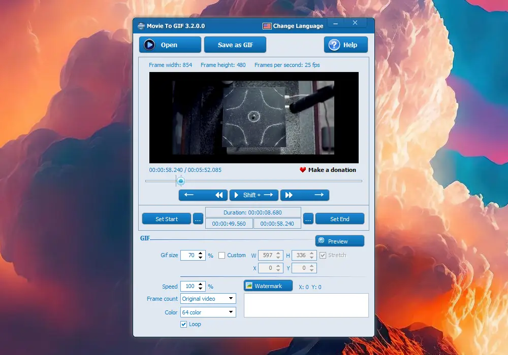 Использование приложения начинается с загрузки видеофайла через стандартное окно выбора. После импорта пользователь может задать нужный временной диапазон, выделив начало и конец фрагмента. Далее настраиваются параметры экспорта: размер изображения, частота кадров и цветовая модель. При необходимости в настройках активируется функция добавления водяного знака — текстового или графического. После всех изменений запускается процесс конвертации, который завершается сохранением готового GIF в указанную папку. Интерфейс остаётся отзывчивым даже при обработке длинных или высококачественных видео.