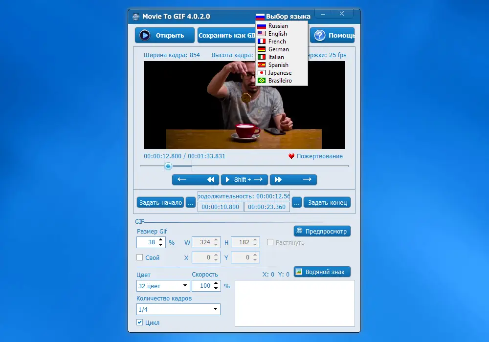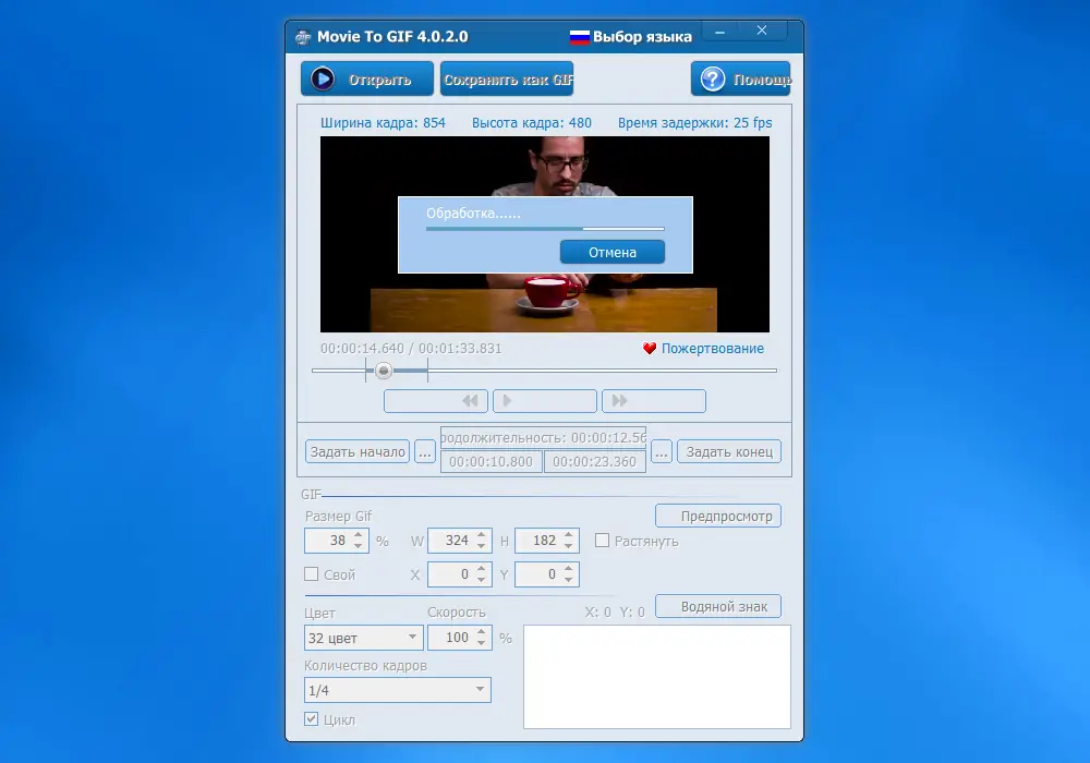 - Конвертирует видео в анимированный GIF с возможностью сохранения исходной скорости и разрешения