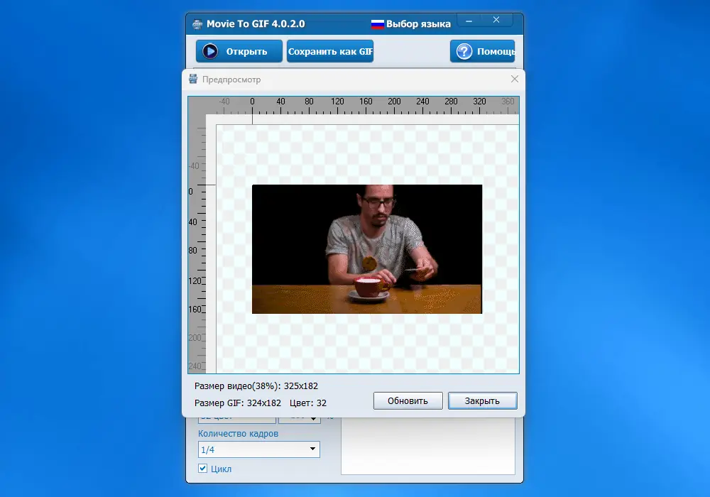 Movie To GIF эффективно справляется с задачей создания лёгких анимированных изображений без потери чёткости и смысла оригинального видео