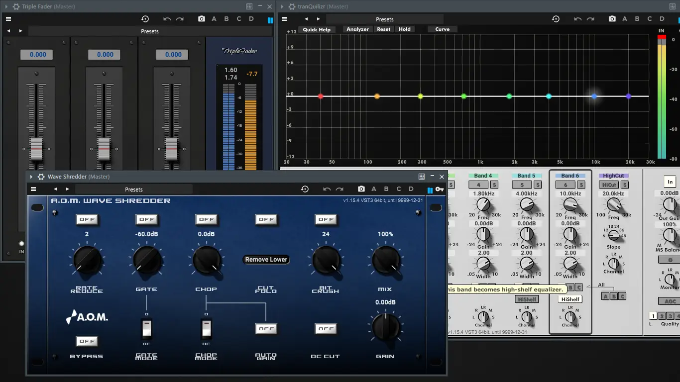 - tranQuilizr — эквалайзер с шестью полосами и поддержкой режимов Mid/Side, отличающийся минимальной задержкой и высокой точностью настройки частот.
