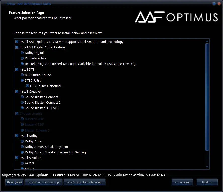AAF DCH Optimus Audio — это комплексный аудио драйвер, разработанный на основе оригинальных решений Realtek с дополнительными модификациями. Он предназначен для улучшения воспроизведения звука на персональных компьютерах, оснащённых аудиочипами Realtek. Программа включает в себя современные технологии пространственного звучания и позволяет пользователям выбирать подходящие компоненты в зависимости от оборудования и предпочтений.