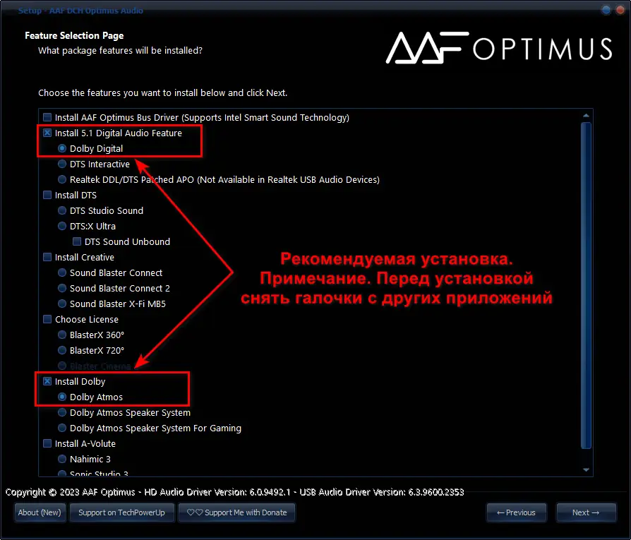 AAF DCH Optimus Audio — модифицированный драйвер для аудиочипов Realtek, объединяющий в себе несколько технологий обработки звука. Программа улучшает качество воспроизведения в музыке, кино и играх, поддерживая такие форматы, как Dolby Atmos, DTS:X Ultra и Nahimic. Установка позволяет выбрать нужные компоненты, избегая конфликтов между разными аудиоускорителями.
