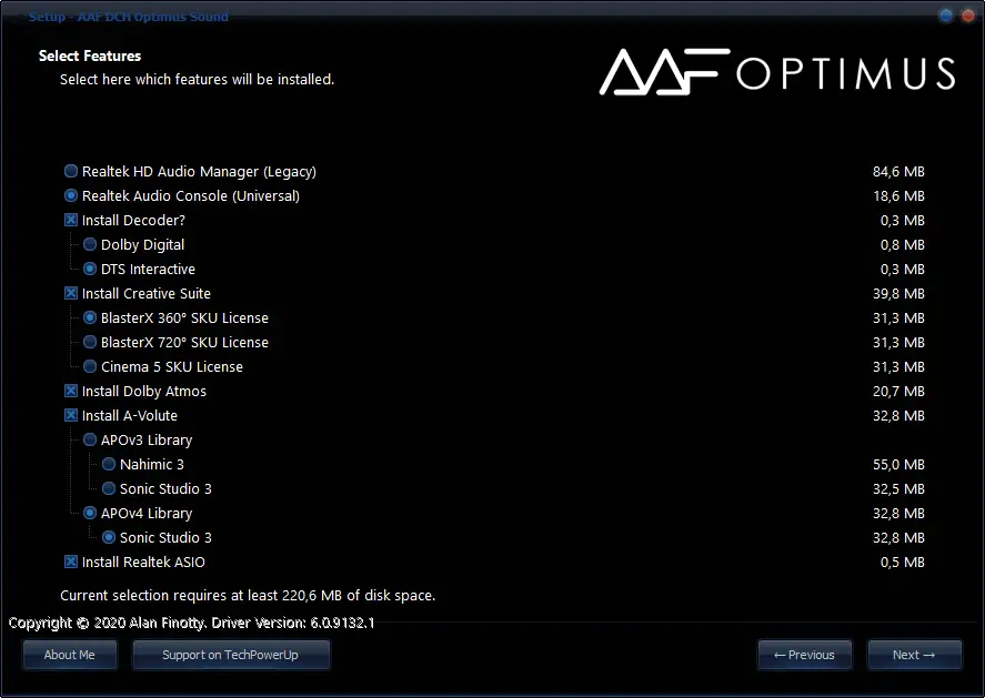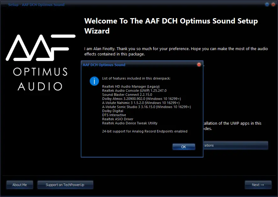 AAF DCH Optimus Sound — модифицированный аудиодрайвер для систем с чипами Realtek, объединяющий несколько технологий улучшения звука. Программа поддерживает установку различных аудиооболочек, включая Dolby Atmos, Nahimic, Sonic Studio и Sound Blaster Connect. Решение ориентировано на пользователей, стремящихся к максимальному качеству воспроизведения в музыке, кино и играх.