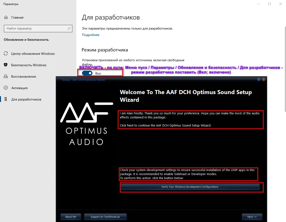 Для корректной установки необходимо включить режим разработчика в системных настройках Windows.