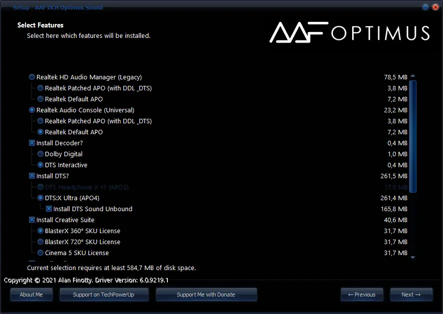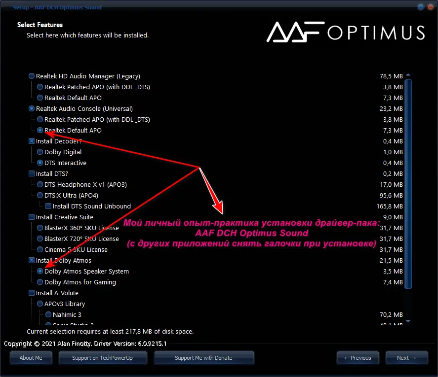 AAF DCH Optimus Sound — универсальный аудио драйвер для материнских плат с чипом Realtek, объединяющий в себе множество технологий улучшения звука. Программа предоставляет выбор между различными аудио-оболочками и эффектами, включая Dolby Atmos, Nahimic, DTS и другие, обеспечивая высокое качество воспроизведения в музыке, фильмах и играх. Поддерживает как HDA, так и UAD режимы, подходя для широкого спектра систем. Особенностью является модифицированная сборка, оптимизированная под максимальную совместимость и производительность. Проект ориентирован исключительно на пользователей с аудиочипами Realtek. Установка требует предварительного удаления старой версии драйвера и перезагрузки системы.