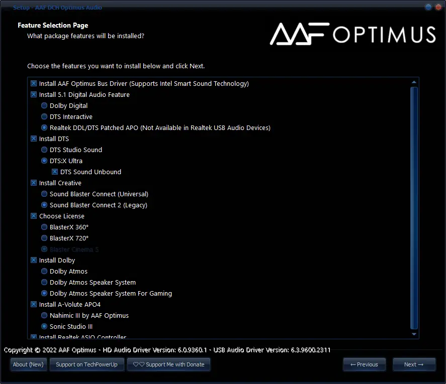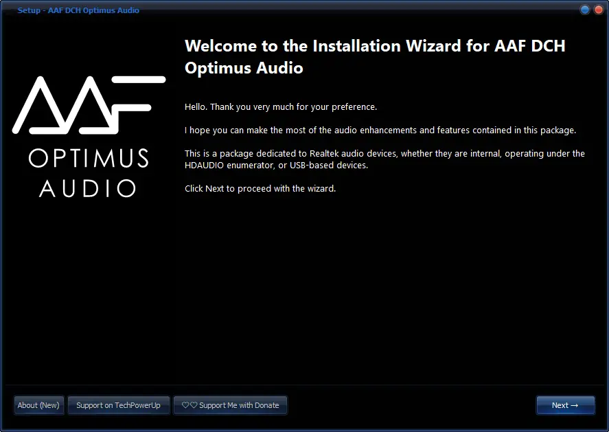 AAF DCH Optimus Sound — модифицированный драйвер для аудиочипов Realtek, объединяющий несколько технологий улучшения звука в едином пакете. Программа поддерживает Dolby Atmos, DTS, Nahimic, Sonic Studio и другие решения, обеспечивая высокое качество звучания в музыке, кино и играх. Подходит исключительно для систем с чипами Realtek, таких как ALC1220, ALC892 и аналоги.