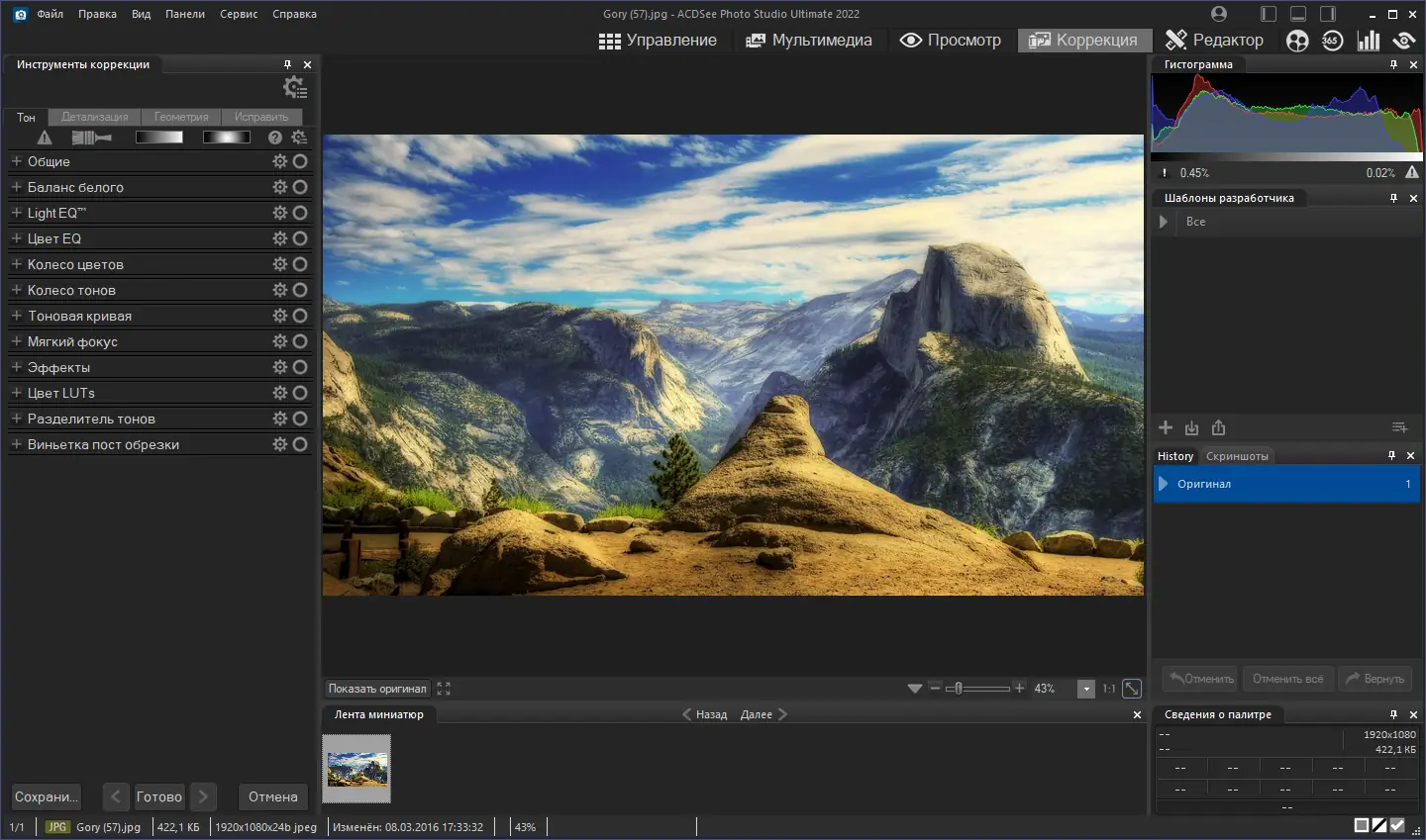 ACDSee Photo Studio — это мощный инструмент для обработки и управления цифровыми изображениями, сочетающий профессиональные функции редактирования, поддержку RAW-форматов и интеллектуальные технологии сортировки. Программа предлагает полный цикл работы с фото: от импорта и каталогизации до сложного редактирования с использованием слоев и GPU-ускорения. Она подходит как для фотографов, стремящихся к идеальному результату, так и для пользователей, которым нужен удобный способ организовать и улучшить свою коллекцию снимков.