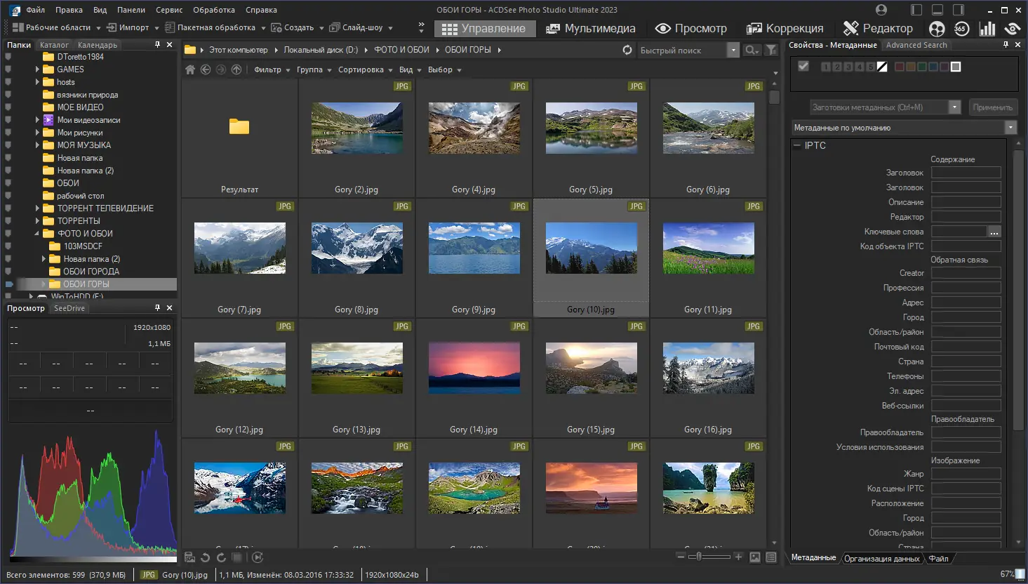 - Интеграция с IPTC-метаданными упрощает сортировку и поиск по ключевым словам, датам и геолокациям.