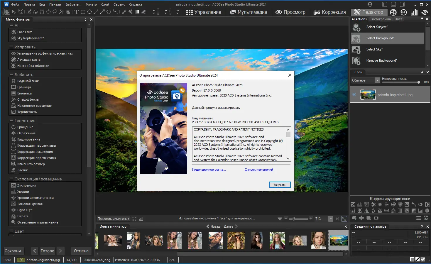 ACDSee Photo Studio — мощный инструмент для обработки и управления цифровыми изображениями, сочетающий профессиональные функции редактирования с удобной системой каталогизации. Программа поддерживает широкий спектр форматов, включая RAW, HEIC и DNG, и предлагает инструменты для неразрушающего редактирования, пакетной обработки и автоматической сортировки с помощью метаданных. Усовершенствованные функции на основе искусственного интеллекта позволяют быстро выделять объекты, небо и фон, а также применять точечные коррекции с высокой степенью контроля. Решение подходит как для фотоэнтузиастов, так и для профессионалов, работающих с большими коллекциями снимков.
