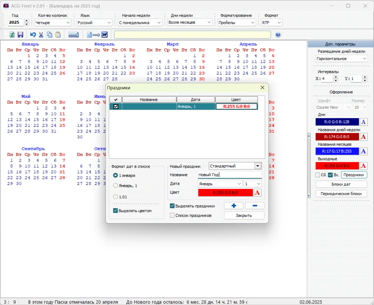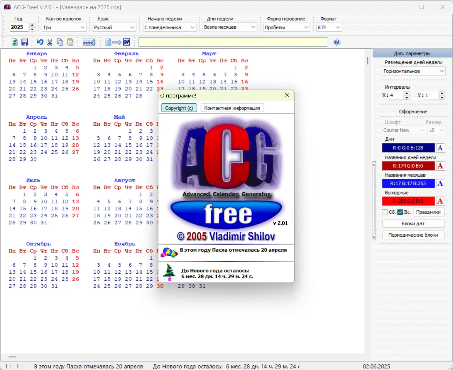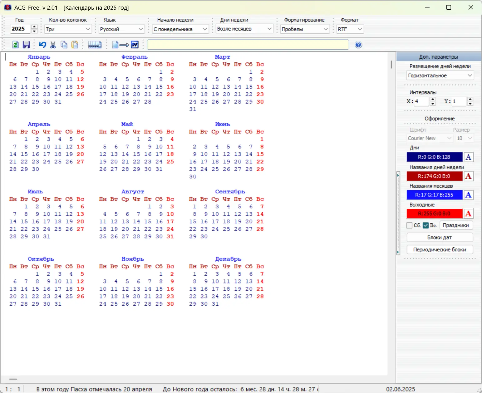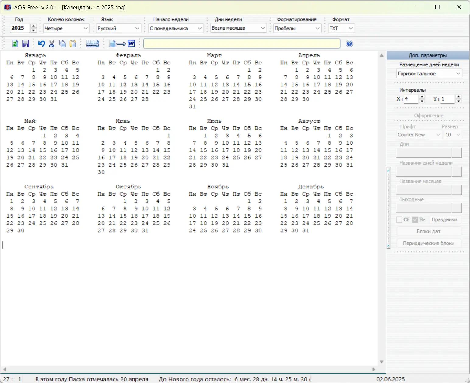 ACG-Free! 2.01 — это легковесное приложение, ориентированное на генерацию календарного текста с высокой степенью настройки. В отличие от большинства аналогов, программа не выводит графические файлы, а создаёт текстовые данные, которые можно свободно редактировать в Word, CorelDRAW или других приложениях. Такой подход обеспечивает максимальную совместимость и упрощает дальнейшую работу с календарём, особенно при верстке и подготовке полиграфической продукции.